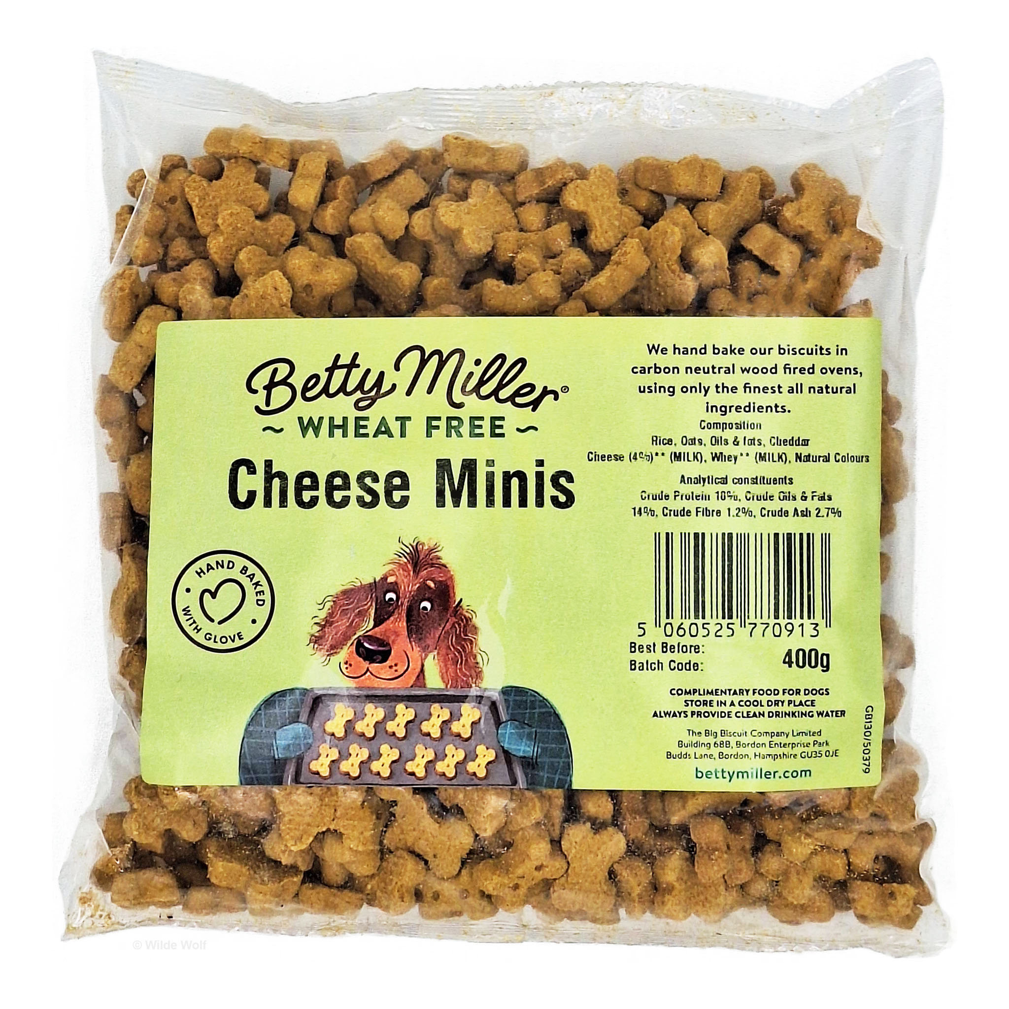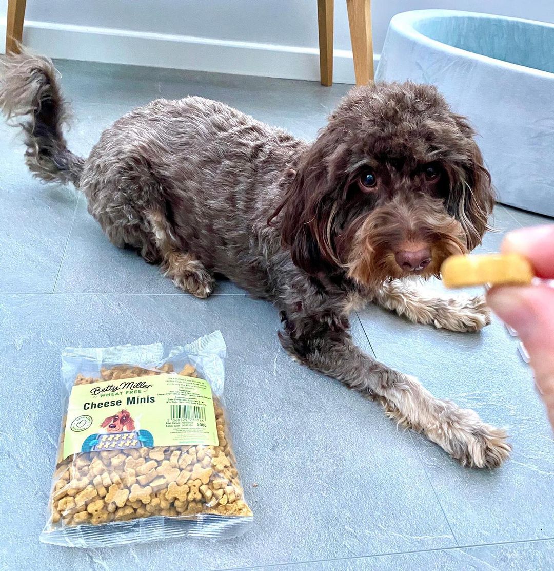 Kleine koekjes met kaas, de meeste honden zijn dol op kaas! Betty Miller Cheese Minis zijn gewoon zo lekker. Het is bovendien een geweldige bron van eiwitten en calcium voor honden. Gemaakt met kaas, rijst, haver en kippenvet. Handgemaakt en gebakken in koolstofneutrale houtgestookte ovens, waarbij alleen de beste, volledig natuurlijke ingrediënten worden gebruikt.