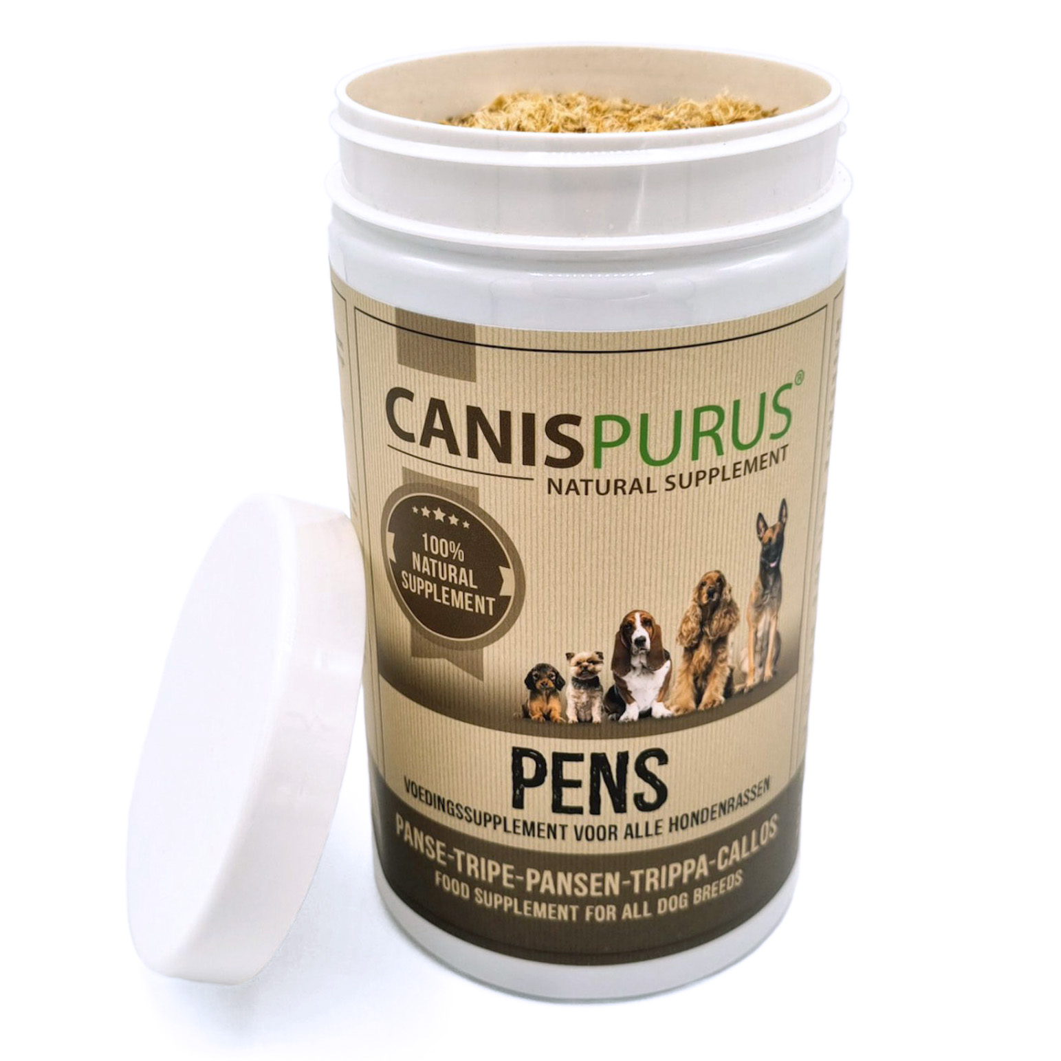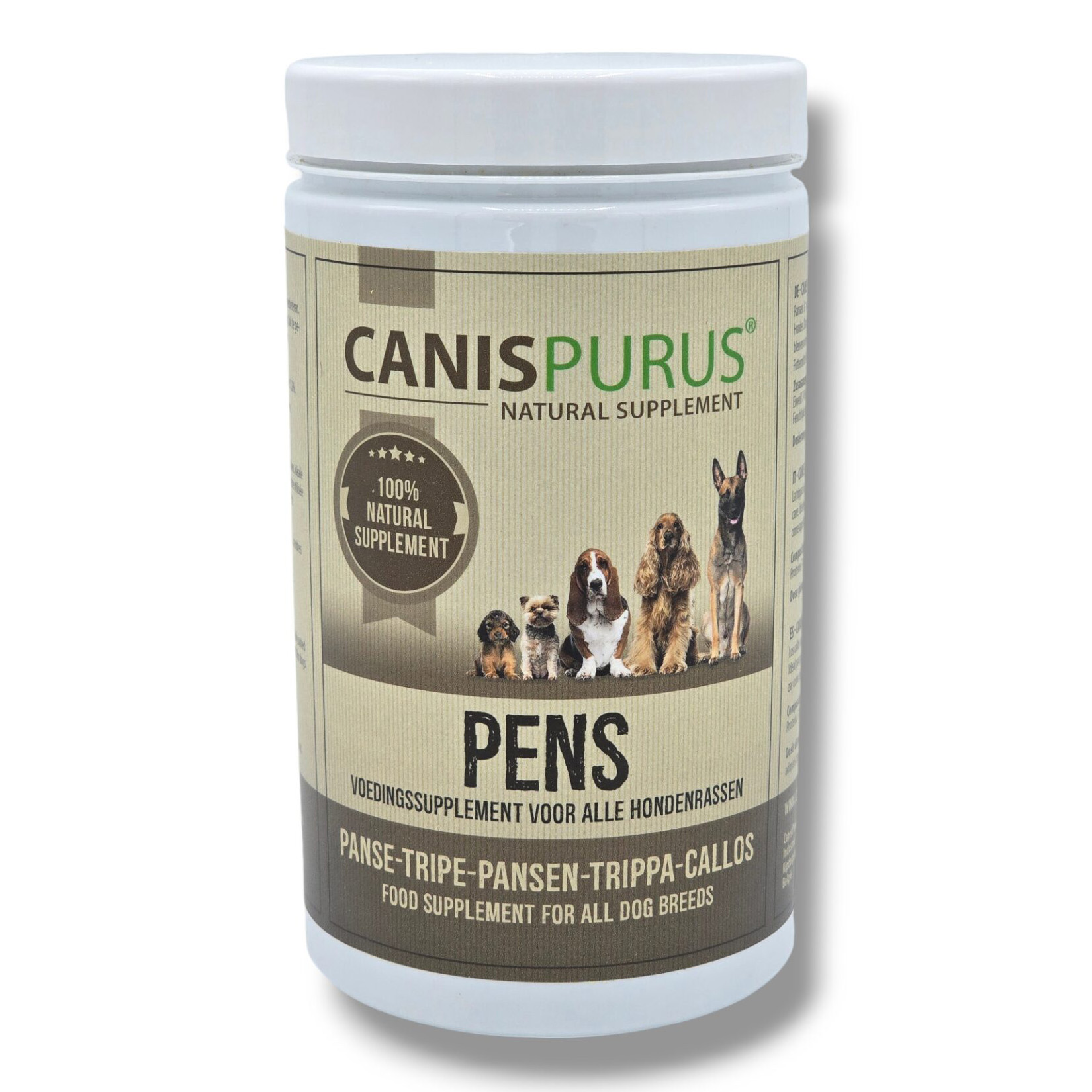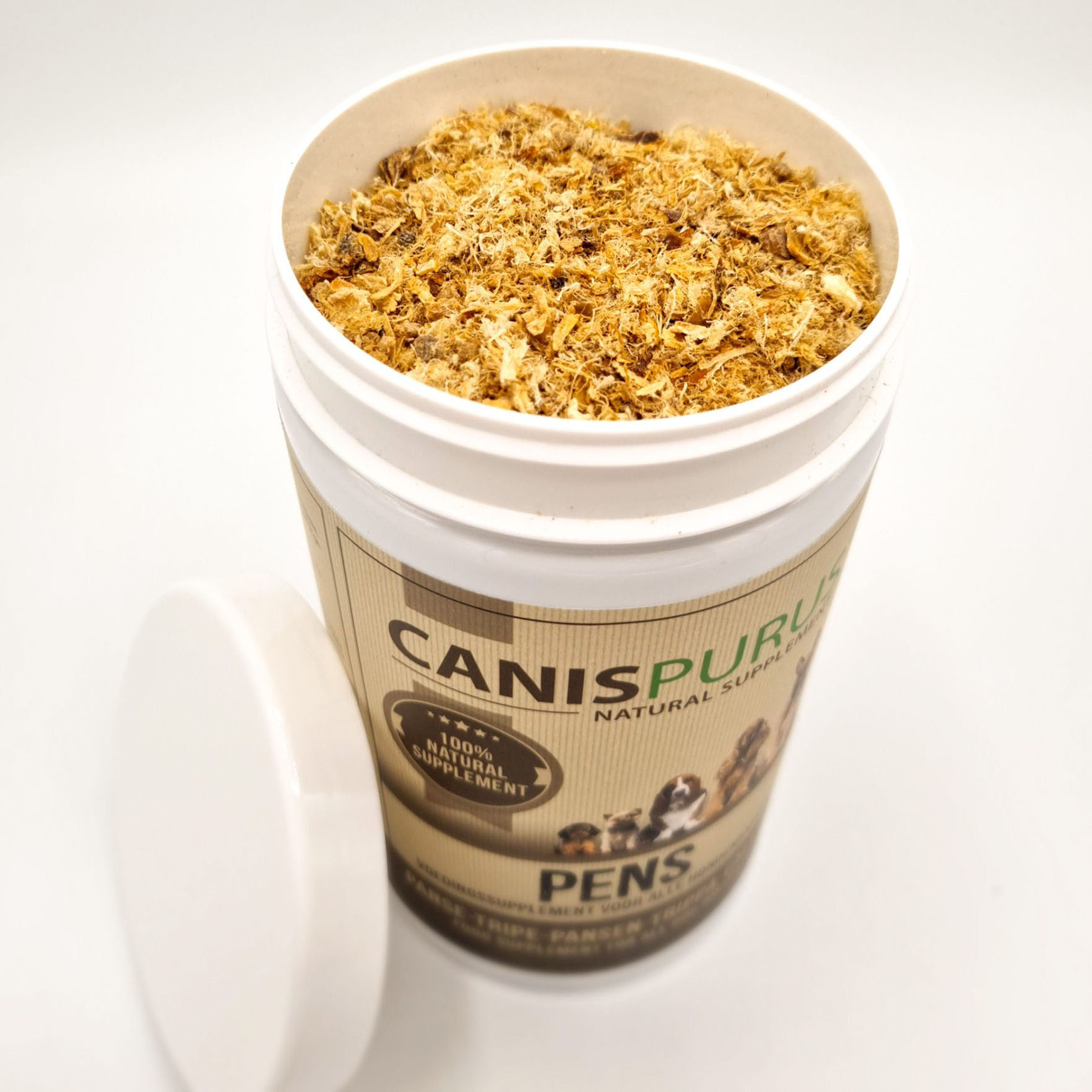 Gedroogde en gemalen pens is een supplement van Canis Purus dat er op gericht is de algemene gezondheid van je hond te verbeteren. Pens heeft de natuurlijke functie om de vertering van voeding te verbeteren. Het herstelt ook de darmflora bij honden met een slappe ontlasting en/of diarree. Pens kan ook gebruikt worden als een natuurlijk lustopwekkend middel bij moeilijk etende honden. Strooi een gedeelte gedroogde pens op het voedsel en je hond heeft meer zin om te eten.