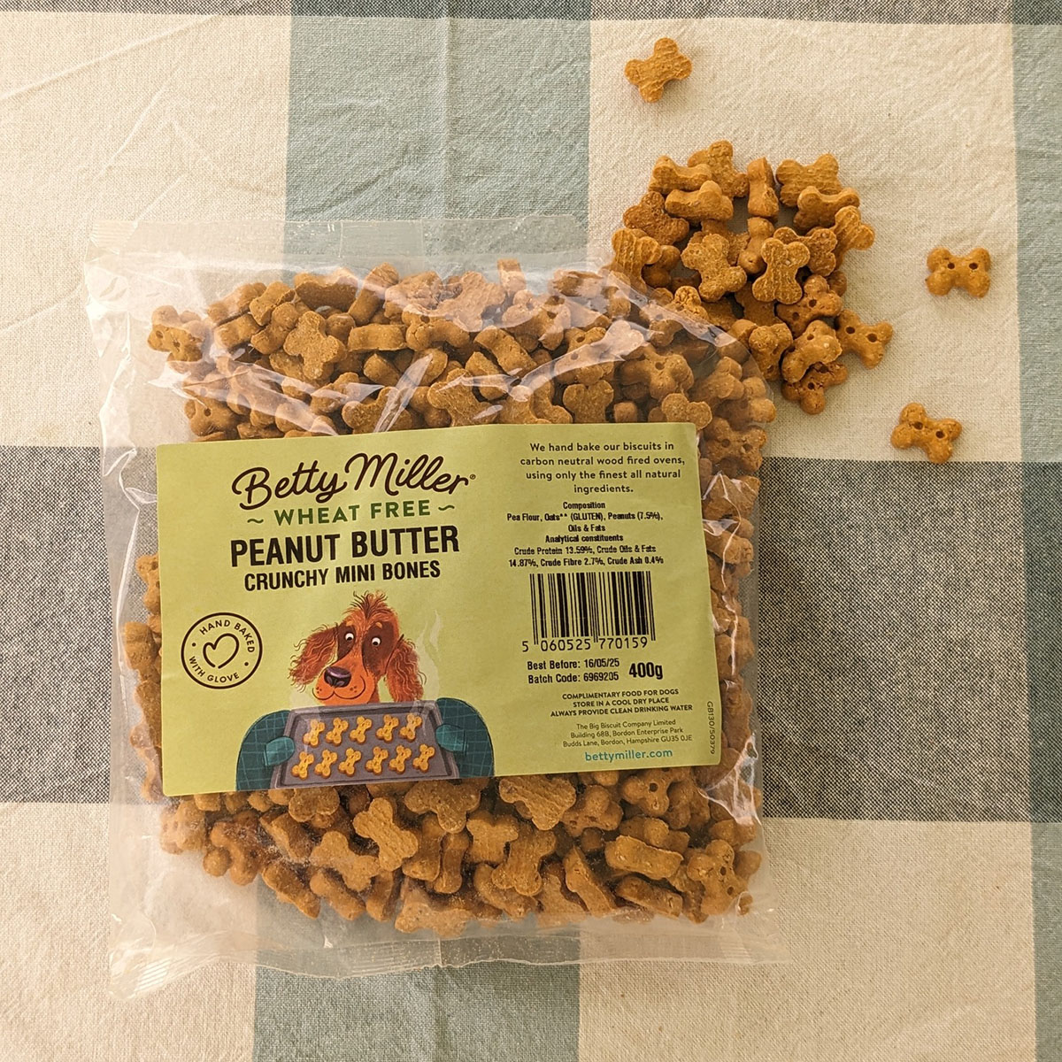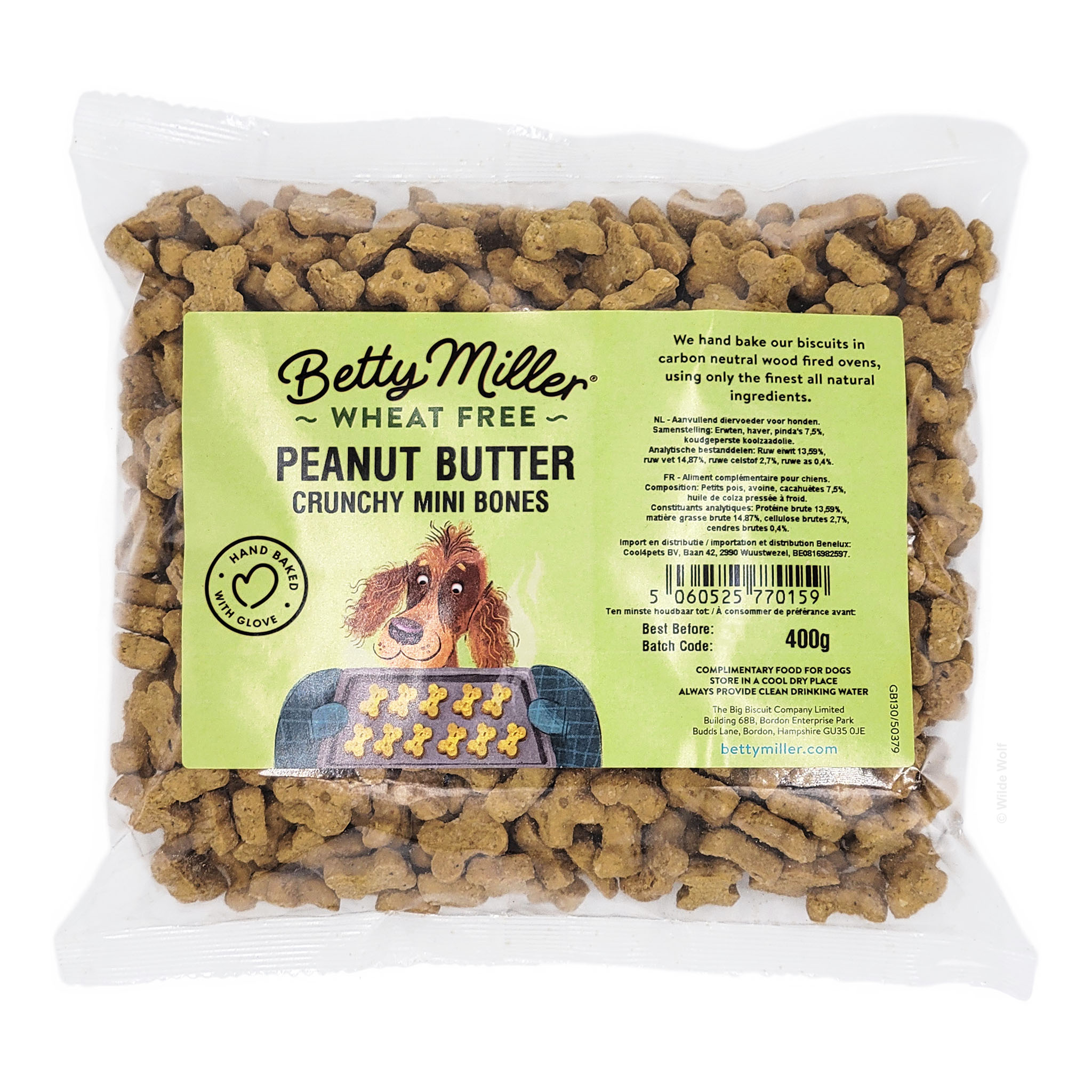 Kleine koekjes met pindakaas. Pindakaas is een fantastische eiwitbron voor honden. Het bevat ook veel gezonde vetten die de vacht kunnen verbeteren en helpen bij droge huidaandoeningen. Het is ook erg lekker en daarom zijn de meeste honden er dol op! Gemaakt met pinda’s, haver, erwten en koudgeperste koolzaadolie. Handgemaakt en gebakken in koolstofneutrale houtgestookte ovens, waarbij alleen de beste, volledig natuurlijke ingrediënten worden gebruikt.